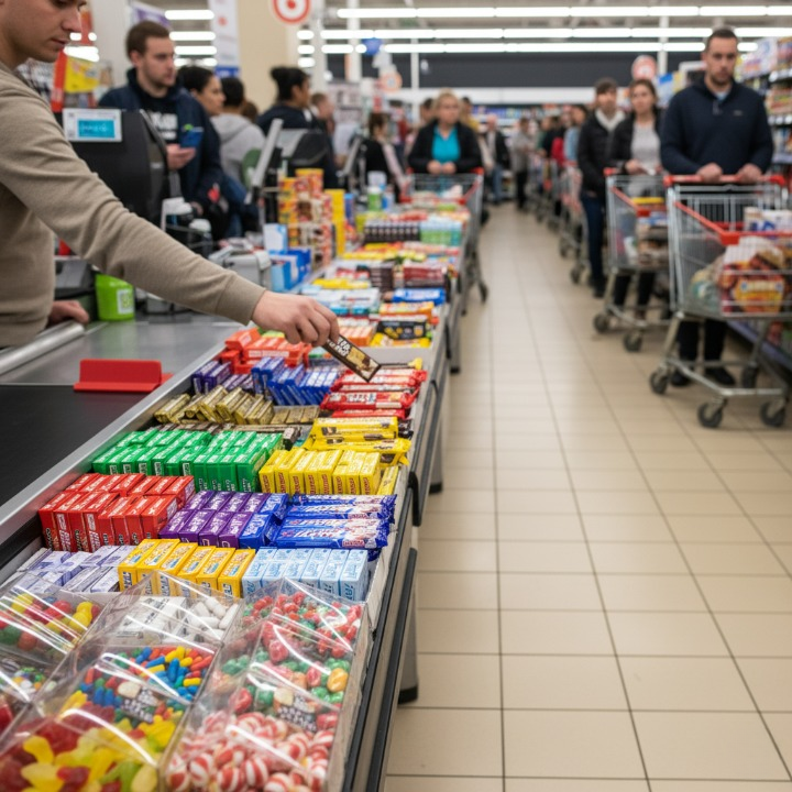 긴 계산대 줄에 서 있으면 '결정 피로' 상태가 됩니다. 이때 눈앞에 보이는 껌, 초콜릿 같은 작고 저렴한 상품들은 큰 고민 없이 집어 들게 만드는 강력한 유혹입니다.