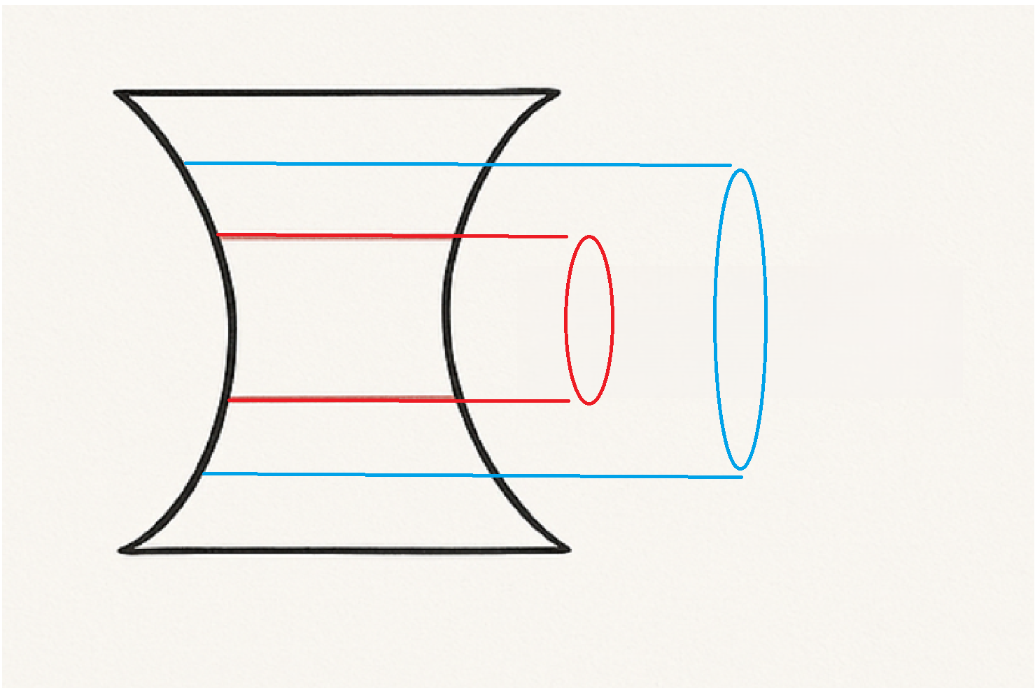 아래 사진과 같이 근시에 들어가는 오목렌즈는 오른쪽 빨간원처럼 사이즈가 작으면 더 얇은 부분에서만 렌즈가 깎여서 가공되지만 파란색 원처럼 사이즈가 크면 더 두꺼운 부분까지 깎이기 때문에 더 두꺼워 집니다.