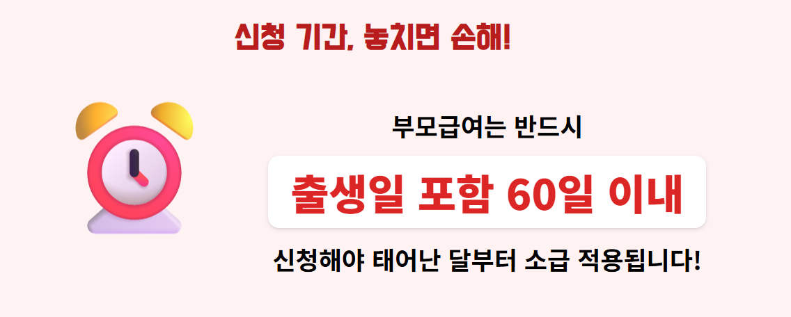 부모급여는 반드시 *출생일 포함 60일 이내*에 신청해야 태어난 달부터 소급해서 받을 수 있어요. 만약 60일이 지나서 신청하면, 신청한 달부터 지급되니 잊지 말고 꼭 기간 내에 신청하세요!