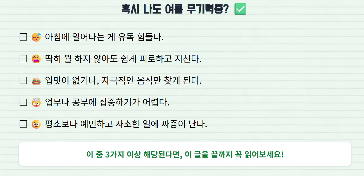 몸과 마음에 직접적인 영향을 미치는 '여름 무기력증(여름 번아웃)'의 신호일 수 있습니다.