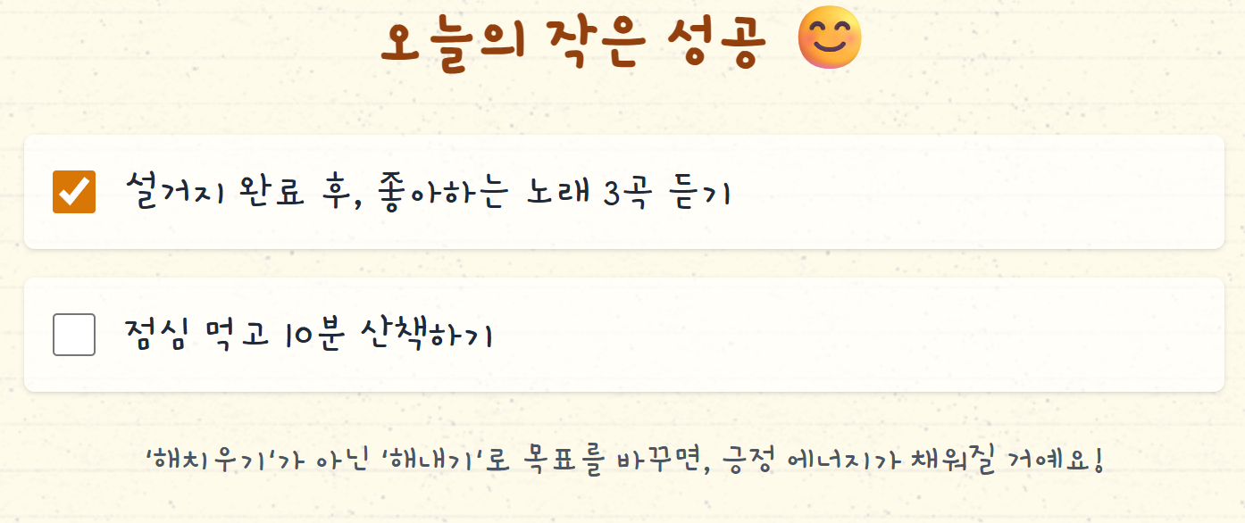 "오늘 집안일 다 해치워야지!" 같은 큰 목표는 시작도 전에 우리를 지치게 만듭니다. 대신 "설거지 한 다음, 좋아하는 노래 3곡 듣기"처럼 작고 성취 가능한 목표를 세워보세요. 작은 성공의 경험이 쌓이면, 무기력했던 마음에 다시 '해낼 수 있다'는 긍정적인 에너지가 채워질 겁니다.